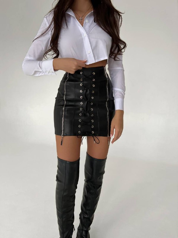 Спідниця з еко-шкіри зі шнурівкою та блискавками легко комбінується з різноманітними верхніми частинами гардеробу – від об’ємних светрів та топів до елегантних блузок та жакетів. Завершіть образ високими чоботами, ботильйонами або класичними туфлями, щоб створити стильний та вишуканий вигляд.